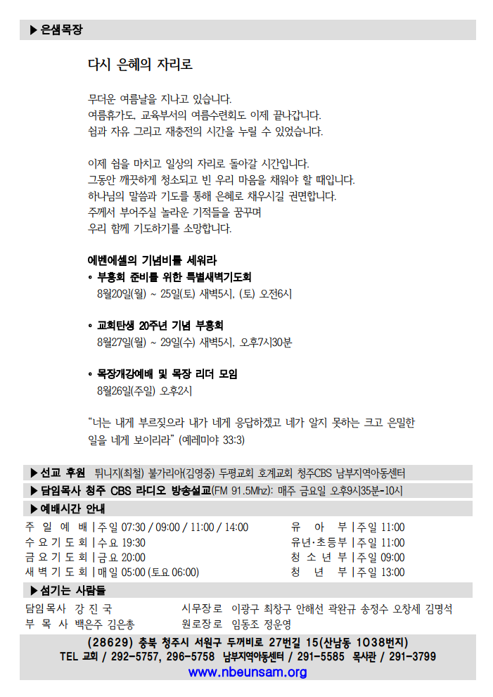 ³²ºÎÀº»ù±³È¸ ûÁֽà ¼¿ø±¸ µÎ²¨ºñ·Î 27¹ø±æ 15(»ê³²µ¿ 1038) TEL : 043-292-5757 / FAX : 043-296-5758