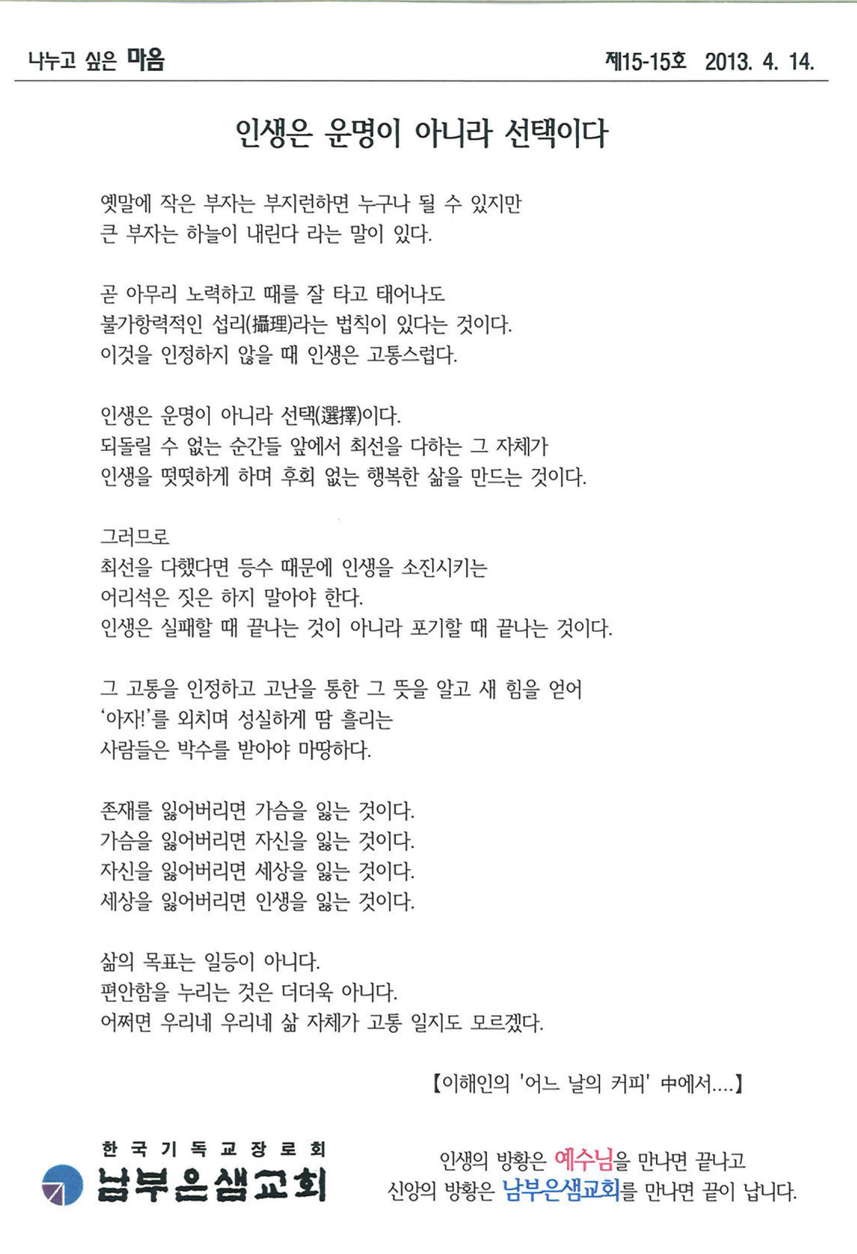 ³ª´©°í ½ÍÀº ¸¶À½ -ÀλýÀº ¿î¸íÀÌ ¾Æ´Ï¶ó ¼±ÅÃÀÌ´Ù (2013-4-14) |