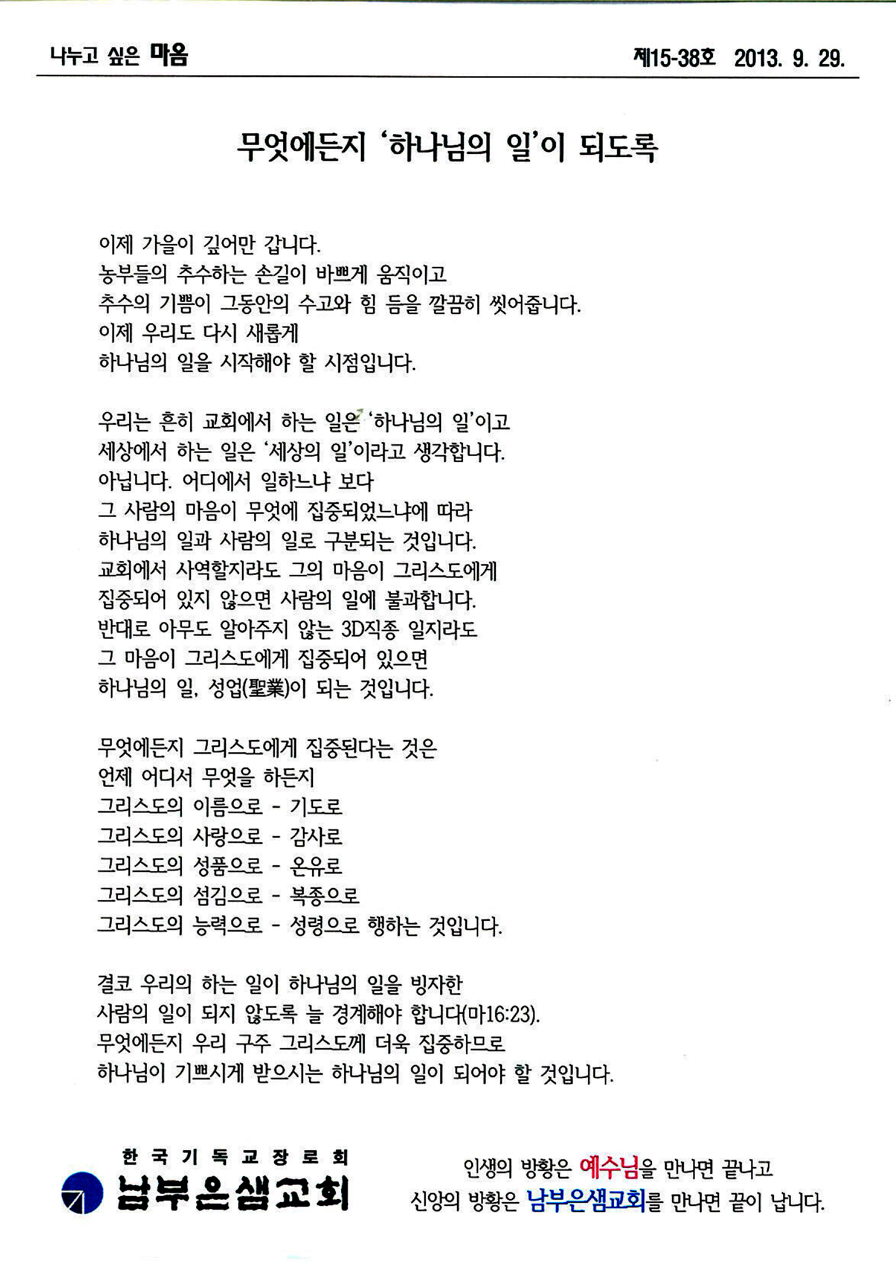 ³ª´©°í ½ÍÀº ¸¶À½ - ¹«¾ù¿¡µçÁö 'Çϳª´ÔÀÇ ÀÏ'ÀÌ µÇµµ·Ï (2013-9-29)